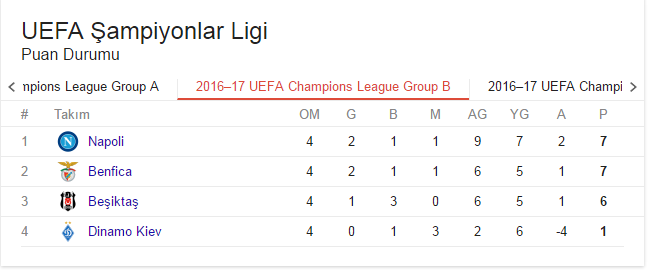 Besiktas Puan Durumu Sampiyonlar Ligi B Grubu Puan Durumu