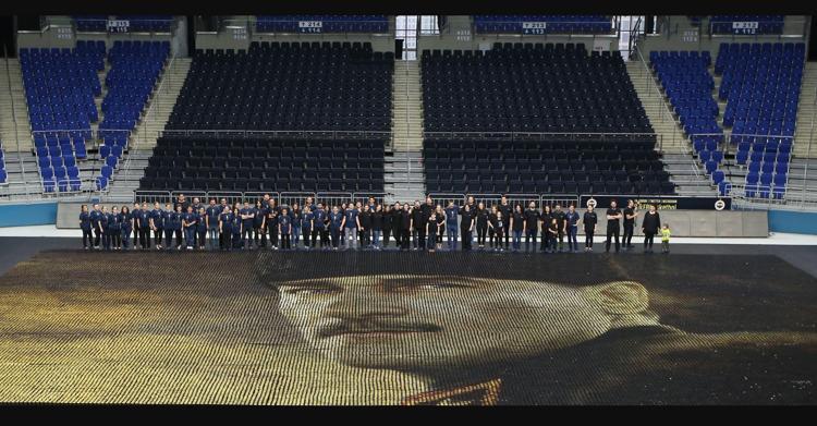 Fenerbahçe spor kulübü 19 mayıs atatürk ü anma gençlik ve spor bayramı için 60 bin renkli bardak ile 28 metreye 15 metre boyutlarında dev bir atatürk portresi oluşturdu.