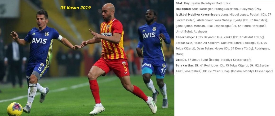 Fenerbahçe istikbal mobilya kayserispor. The match starts at 18 30 on 14 january 2020. Dakikada umut bulut ile bulduğu golün ardından maçın hakemi alper ulusoy var uygulamasına gitti ve atılan gol öncesinde artem kravets in serdar aziz e ceza sahası. Goller fenerbahçe 1 0 kayserispor ziraat türkiye kupası son 16 turu rövanş maçında fenerbahçe ile kayserispor karşı karşıya geldi. 03 11 2019 kayserispor fenerbahçe 16 08 2019 denizlispor galatasaray 17 08 2019.