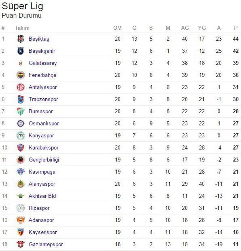 Puan Durumu 18 Hafta Super Lig Puan Durumu Ve Mac Sonuclari