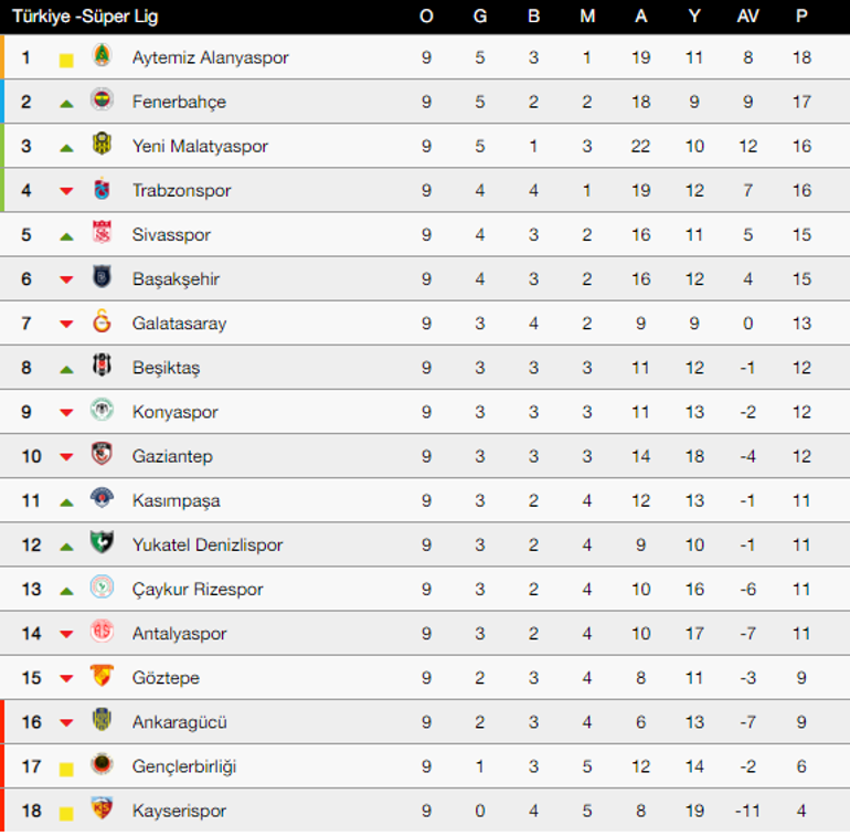Super Lig De 9 Haftasinda Son Puan Durumu Super Lig Puan Durumu Nasil Sekillendi