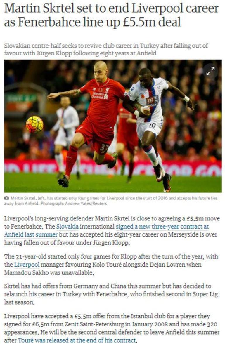 Martin Skrtel 5 5 Milyon Pound A Fenerbahce De Spor Haberleri