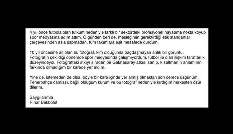 Bein sports ta bir süredir programlar hazırlayan bekbölet fotoğrafın sosyal medyada yayılmasının ve fenerbahçe taraftarlarının yoğun tepkisinin ardından kişisel. Pınar bekbölet paylaştığı bir fotoğraf nedeniyle işinden oldu. Fenerbahçe ye hakaret içeren galatasaray atkısıyla çekilen bir fotoğrafı sosyal medyada yayılan bein sports sunucusu pınar bekbölet in işine son verildi. Fenerbahçe ye hakaret içeren galatasaray atkısıyla çekilmiş fotoğrafı ortaya çıkan pınar bekbölet in yayıncı kuruluş ile yolları ayrıldı.